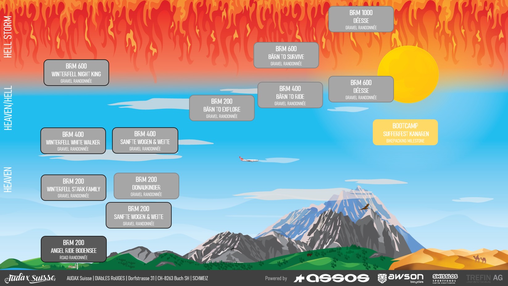 beinhalten neben Feldwegen auch lange Abschnitte auf technisch einfachen bis mittelschweren Singletrails und/oder Abschnitte mit tiefem Schotter. Bei diesen Ultra Distance-Anlässen sind nur Mountainbikes oder Gravelbikes mit entsprechender Übersetzung am Start.