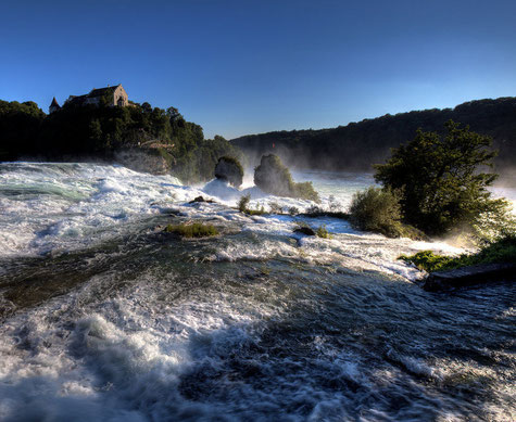 Der Rheinfall gehört mit dem gleich hohen Sarpsfossen in Norwegen zu den drei grössten Wasserfällen in Europa. Dabei ist der Sarpsfossen mit durchschnittlich 577 m³/s wasserreicher, während der doppelt so hohe Dettifoss auf Island nur etwa halb so viel Wasser führt. Der Rheinfall befindet sich in der Schweiz auf dem Gebiet der Gemeinden Neuhausen am Rheinfall im Kanton Schaffhausen (rechtsufrig) und Laufen-Uhwiesen im Kanton Zürich (linksufrig), rund vier Kilometer westlich unterhalb der Stadt Schaffhausen (Quelle).