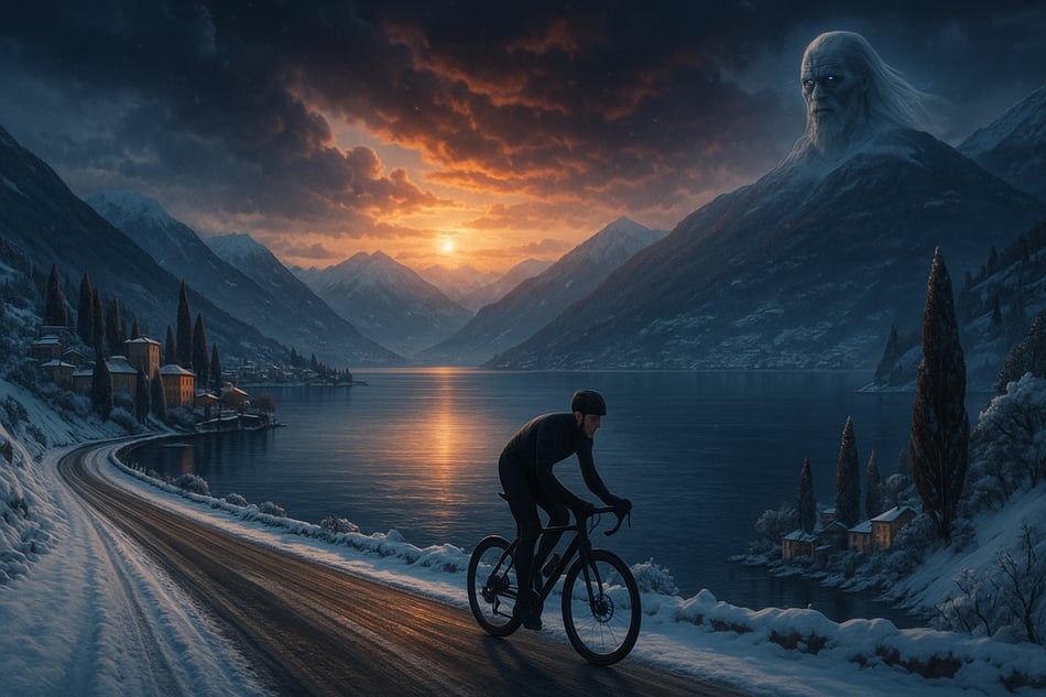 Der Lago di Lugano liegt vor Dir wie eine blank polierte Klinge. Die SBB-Uhr tickt nicht, sie richtet. Du hebst die Hand zum Schwur und rollst an: Süden im Kopf, Winterfell im Herzen. Palmen tun so, als wäre es Sommer. Dein Tacho weiss es besser. Am Lago di Varese sirrt die Luft, als hätten die Mücken Eis in den Adern. Müdigkeit? Ein Vertrag mit klaren Klauseln: alle 15 Minuten Kalorien, Handschuhschicht wechseln, Kopf sortieren. Novara zeichnet Dir eine Linie in die Stirn. Das GPS sagt "geradeaus", Du sagst "so sei es". Heldentum spricht leise, wie eine Kette auf einem sauberen Ritzel.