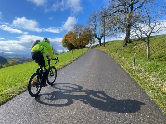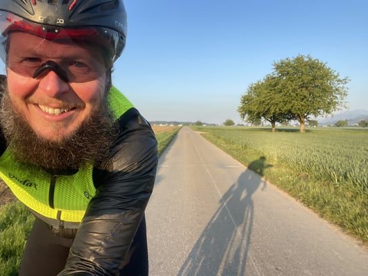 Mit Christian haben wir einen Berner an Bord, der ab und zu auch den gemütlichen "Öpfelchüechli mit Vanillesauce" Berner spielt. Andererseits kann er sich im fast gleichen Atemzug freiwillig ein 400-km-GPX-File zum Frühstück reinziehen. Trocken. Ohne Butter. Seiner gemütlichen Art verdanken wir es, dass er keine rücksichtslose Route mit Liebe für steile Rampen komponiert hat. Es gibt also keine vergifteten Törtchen mit Zuckerguss, sondern ein fairer randonneurischer Charaktertest mit Aussicht und Glanz. Danke Chrigu, ohne Dich wäre es einfach nur ein schöner Tag auf dem Velo. So aber ... wird es unvergesslich. Ob man will oder nicht.